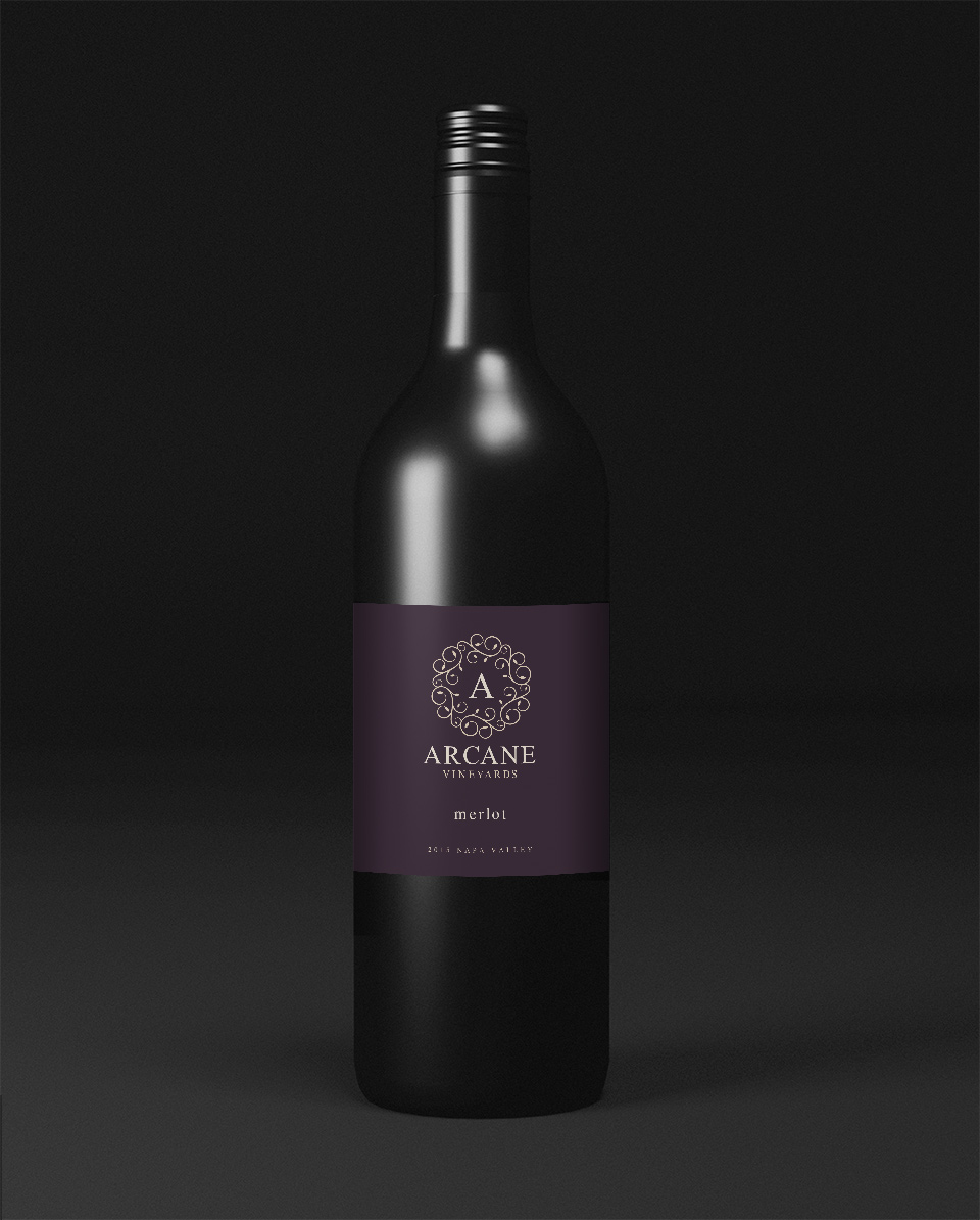Arcane Vineyards Wine labels for Arcane Vineyards Merlot and Pinot Gris in their signature black bottles. BrandingPackaging Hide Content